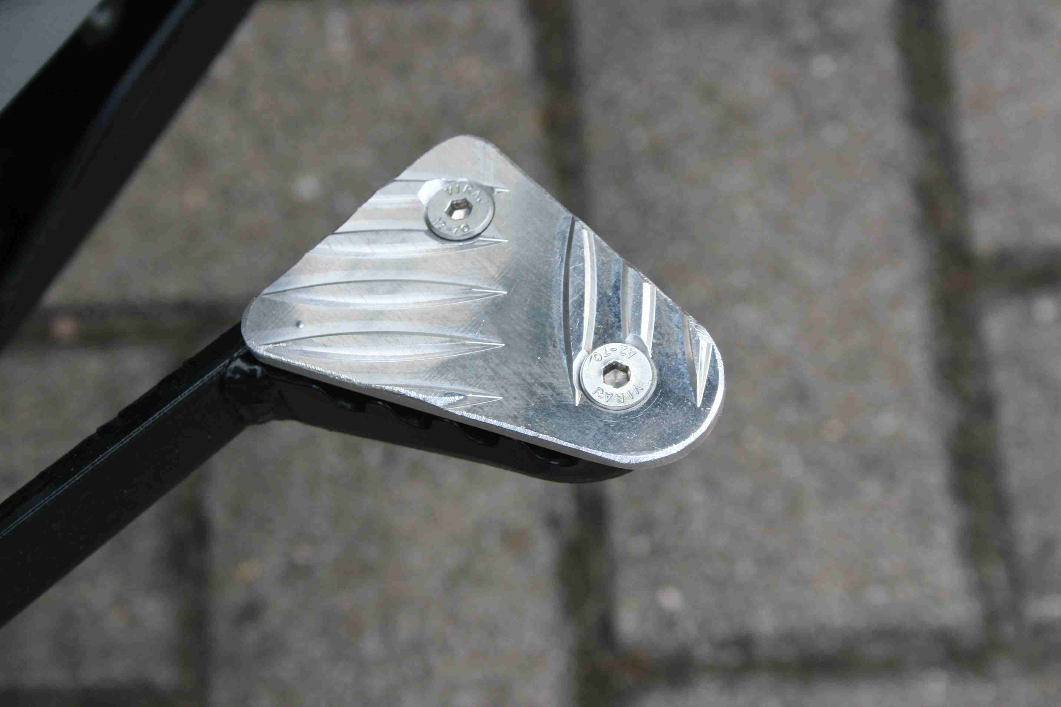 Der Ganghebel reicht bis zur Mitte der Fußraste, das Bremspedal ist viel zu weit links von der Fußraste.