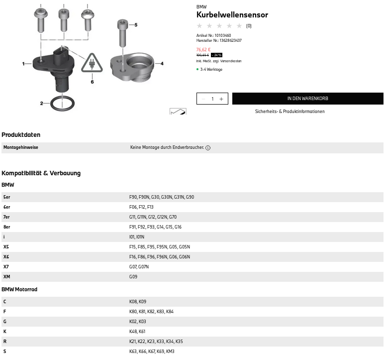 Kürzlich, auf einer Motorradtour durch Schweden blieb uns eine BMW G310 R (Baujahr 2016) mit einem Fehler im Kurbelwellensensor (crankshaft position sensor) nahe Malmö liegen. Symptome: unvermitteltes Absterben des Motors, Leistungsverlust, Motorfehleranzeige im Display. Einen Tag später bewerkstelligten wir mit Hilfe von http://www.bikesupport.se (die kompetenten und hilfsbereiten Mitarbeiter dort, können wir unbedingt weiterempfehlen) den Transport in die BMW Werkstatt JE68 ( Teknikvägen 6, 246 43 Löddeköpinge). Dort wurde der Fehler bestätigt und vorgeschlagen, den Sensor zu ersetzen. Leider war es der Werkstatt bis jetzt nicht möglich, die korrekte Teilenummer des Sensors zu ermitteln. Im BMW Ersatzteilkatalog ist lediglich eine Teilenummer für das Fahrzeug nach der Modellpflege 2020 gelistet. Für die Modelljahre 2016-2020 ist zwar eine Abbildung im Teilekatolog vorhanden, jedoch fehlt die Teilenummer. Die Werkstatt hat inzwischen bei BMW angefragt, aber bis jetzt gab es kein Antwort, so dass wir die Abholung des Fahrzeugs immer wieder verschieben mussten. Eine Anfrage bei einem BWM Händler in Deutschland bestätigte diesen Sachstand (Teilenummer für Kurbelwellensensor erst ab Modelljahr 2020 gelistet).