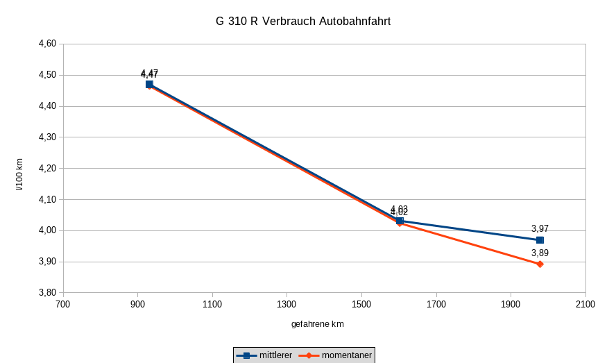 Insgesamt also, für alle Betriebsarten, sehr erfreuliche Verbrauchswerte, die Ihresgleichen suchen. Dabei wird die G 310 nur noch von der Sommer-Diesel geschlagen : - ).